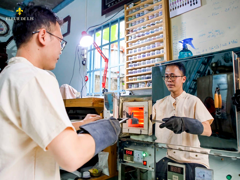 Đầu tiên là bước tạo ra một mặt số Pháp Lam, người nghệ nhân phải trải qua rất nhiều công đoạn thủ công. Phần kim loại nền sẽ được xử lý bề mặt, sau đó các khoang nhỏ được tạo ra để chứa men màu. Men sau đó được đưa vào từng chi tiết nhỏ, rồi đem đi nung ở nhiệt độ 800 - 900°C.